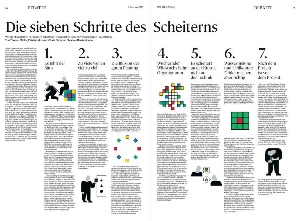Unter dem Titel „Die sieben Schritte des Scheiterns“ beschreiben der Journalist Thomas Müller und die Journalistin Patrizia Messmer, warum viele IT-Projekte scheitern – sei es durch fehlende Zielsetzung, überbordende Komplexität oder eine unterschätzte Projektkultur.
